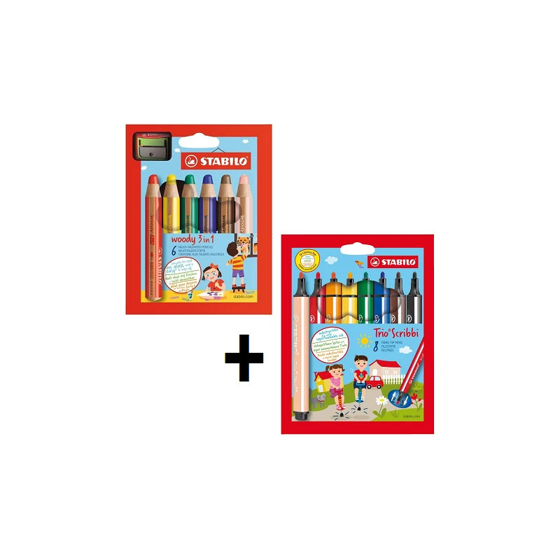 Balíček obsahuje: Fixy STABILO Trio Scribbi 8 ks a Pastelko-vodovko-voskovky Woody 6ks + ořezávátko.