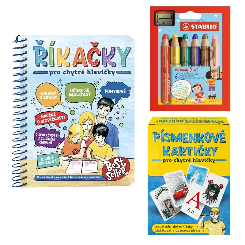 Balíček obsahuje: abecední karty Písmenkové kartičky, knížku originálních říkanek Říkačky pro chytré hlavičky a Pastelko-vodovko-voskovky Woody 6 ks.