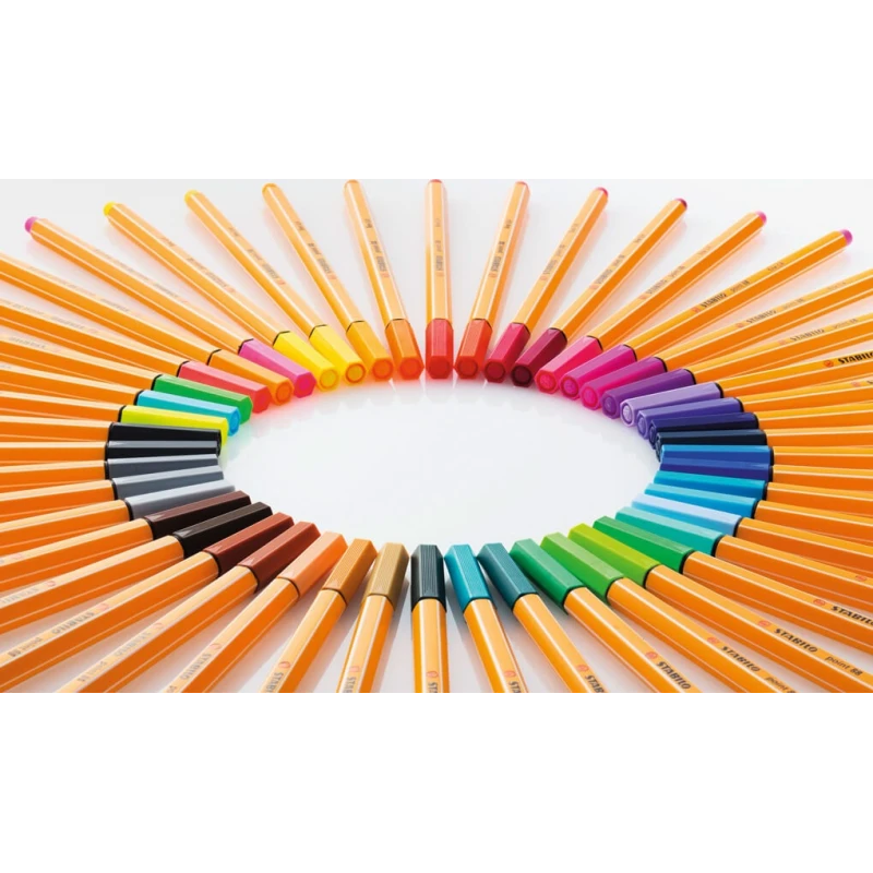 STABILO point 88 je perfektní pro děti, studenty i profesionály. Vyrábí se v nezměněné podobě již od roku 1977 a lidé po celém světě oceňují jeho kvalitu a všestrannou použitelnost v každé situaci. Slavný šestihranný tvar STABILO point 88 s bílými proužky na hranách se velmi příjemně drží. 47 barev zaručí, že vždy najdete ideální odstín, který potřebujete. Pro zářivější poznámky je v nabídce také 6 neonových barev.