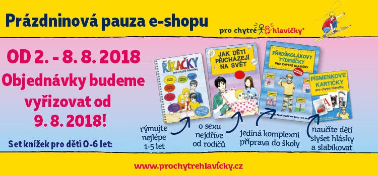 V období od 2. 8. - 8. 8. 2018 probíhá prázdninová pauza v e-shopech www.prochytrehlavicky.cz a www.zdraveomlazeni.cz/eshop. Veškeré objednávky budeme vyřizovat od 9. 8. 2018.