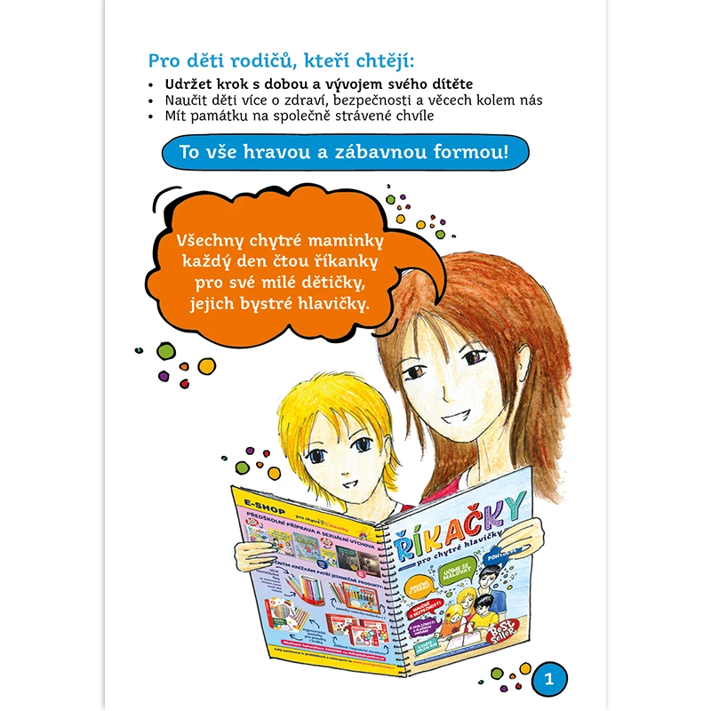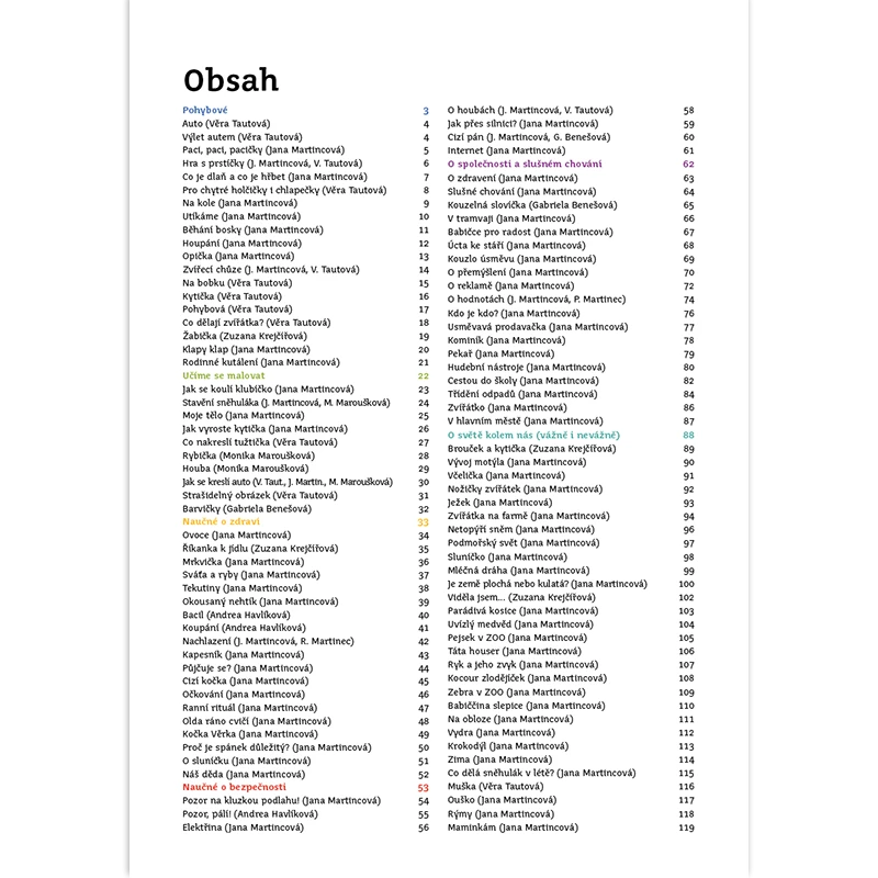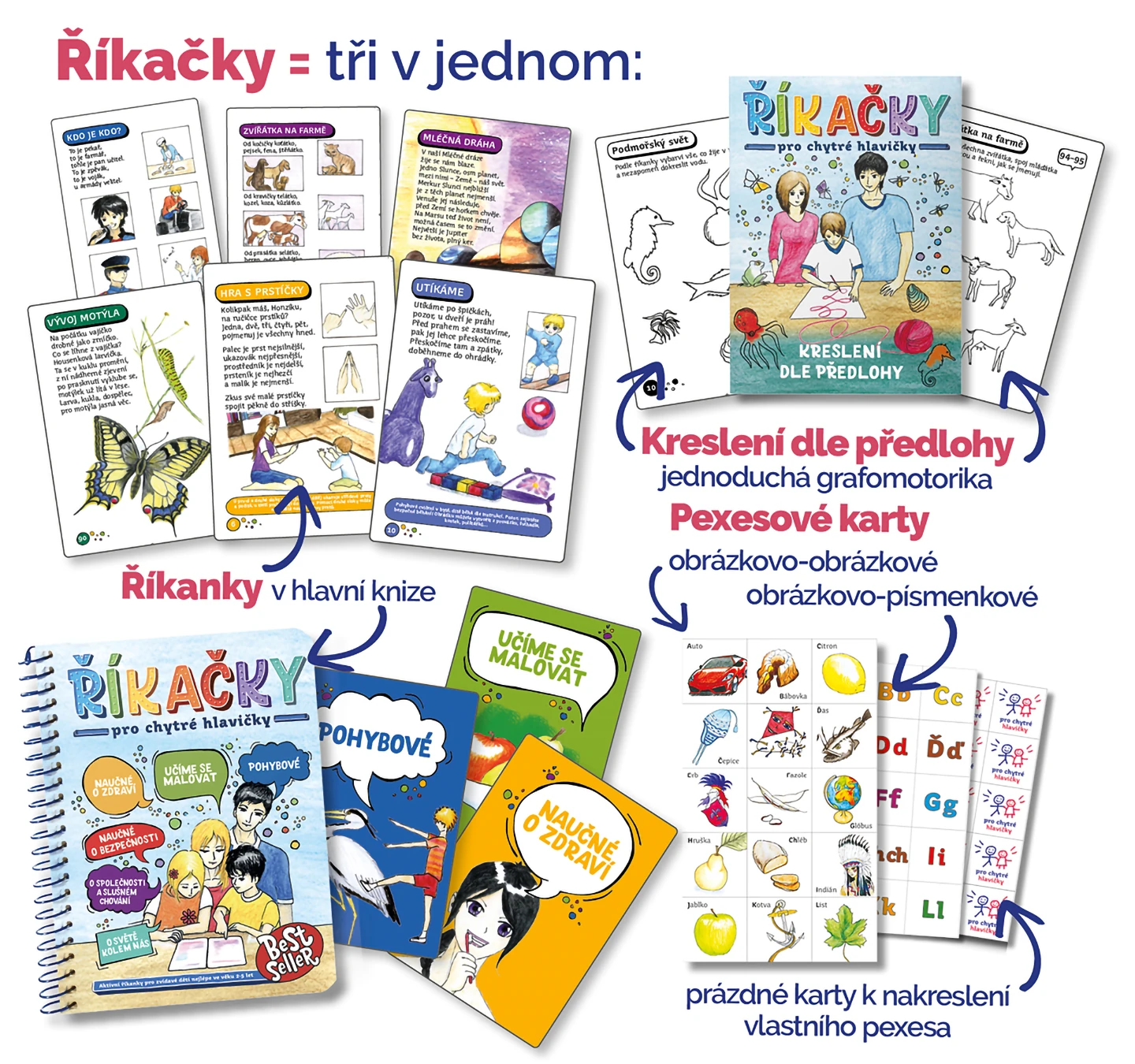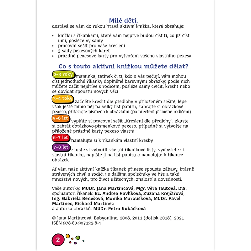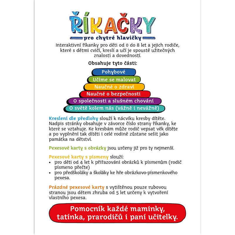Nové, doplněné a upravené vydání oblíbených říkanek pro děti od 0 do 8 let (nejlépe 2-5 let). Kniha je doplněna o Kreslení dle předlohy a pexesové karty. Jiné říkanky! Posunou Vaše dítě dále! O zdraví, bezpečnosti a světě kolem nás s cvičením a kreslením.
