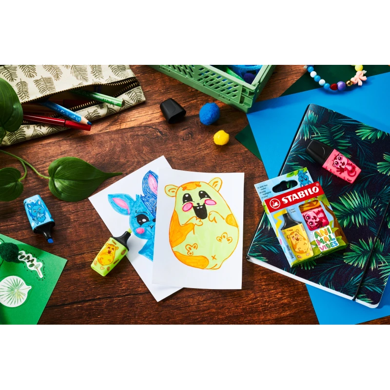 STABILO BOSS MINI Animal Vibes přináší do každého penálu zářivé barvy a hravé kouzlo. Díky 3 klasickým neonovým odstínům, dvěma šířkám stopy (2 mm a 5 mm) a kompaktnímu formátu je ideální pro děti, které rády zvýrazňují, organizují a tvoří. Každý zvýrazňovač má jedinečný zvířecí design – netopýr, surikata, nebo křeček – což dodává každému úkolu osobitost. Díky technologii STABILO Anti-Dry Out jej lze používat až 4 hodiny, aniž by vyschl. Edice STABILO Animal Vibes obsahuje také odpovídající sady silných krátkých pastelek STABILO Trio, fixů STABILO Pen 68 Mini a linerů STABILO point 88 Mini – pro ucelený a kreativní zážitek.