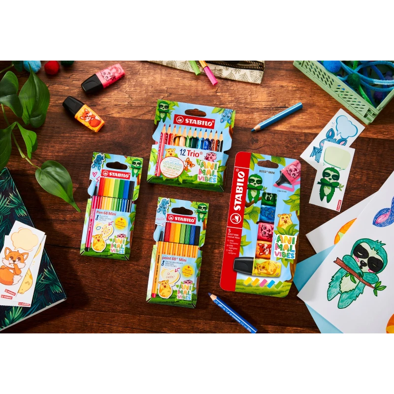 • Edice Animal Vibes obsahuje také silné krátké pastelky STABILO Trio, fixy STABILO Pen 68 Mini a linery STABILO point 88 Mini.